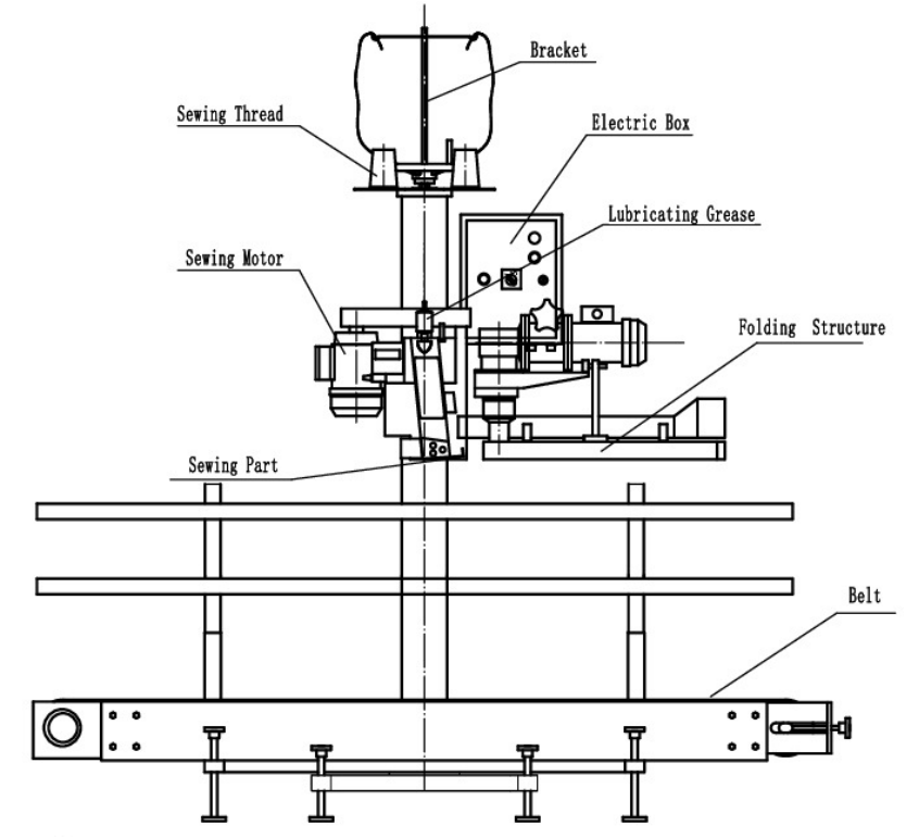 1. It is consisting of belt conveyor, sewing machine, folding structure, post and electric control system.